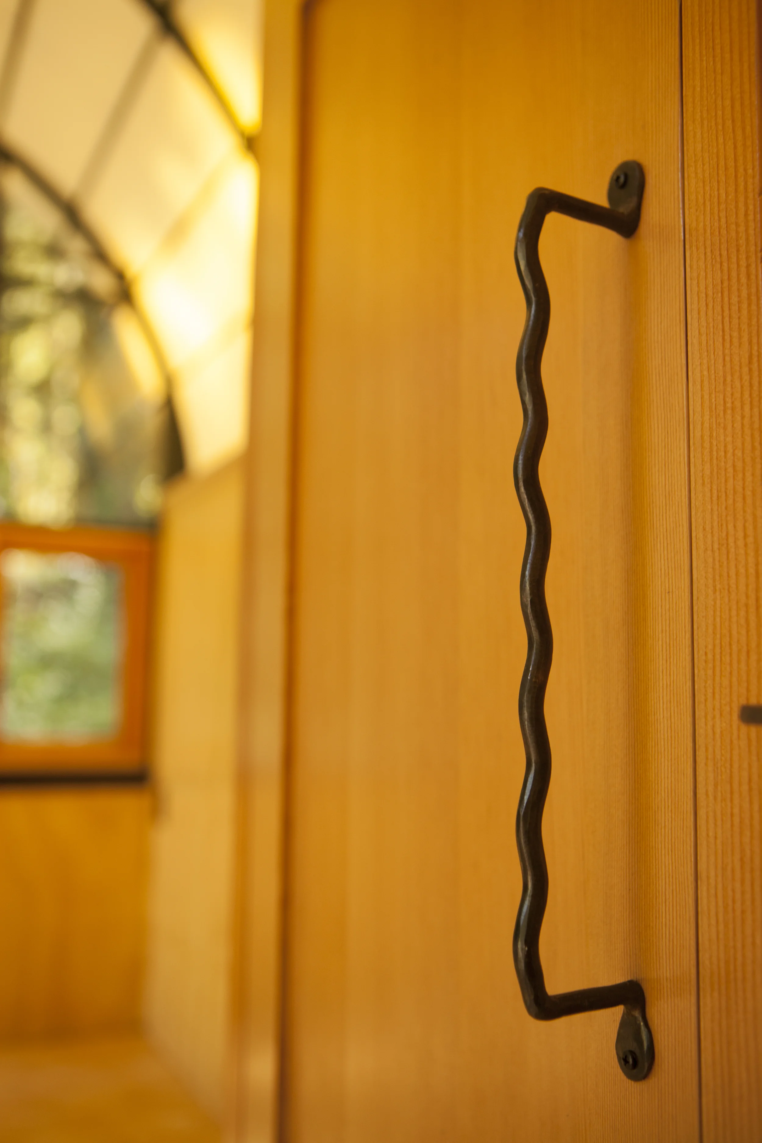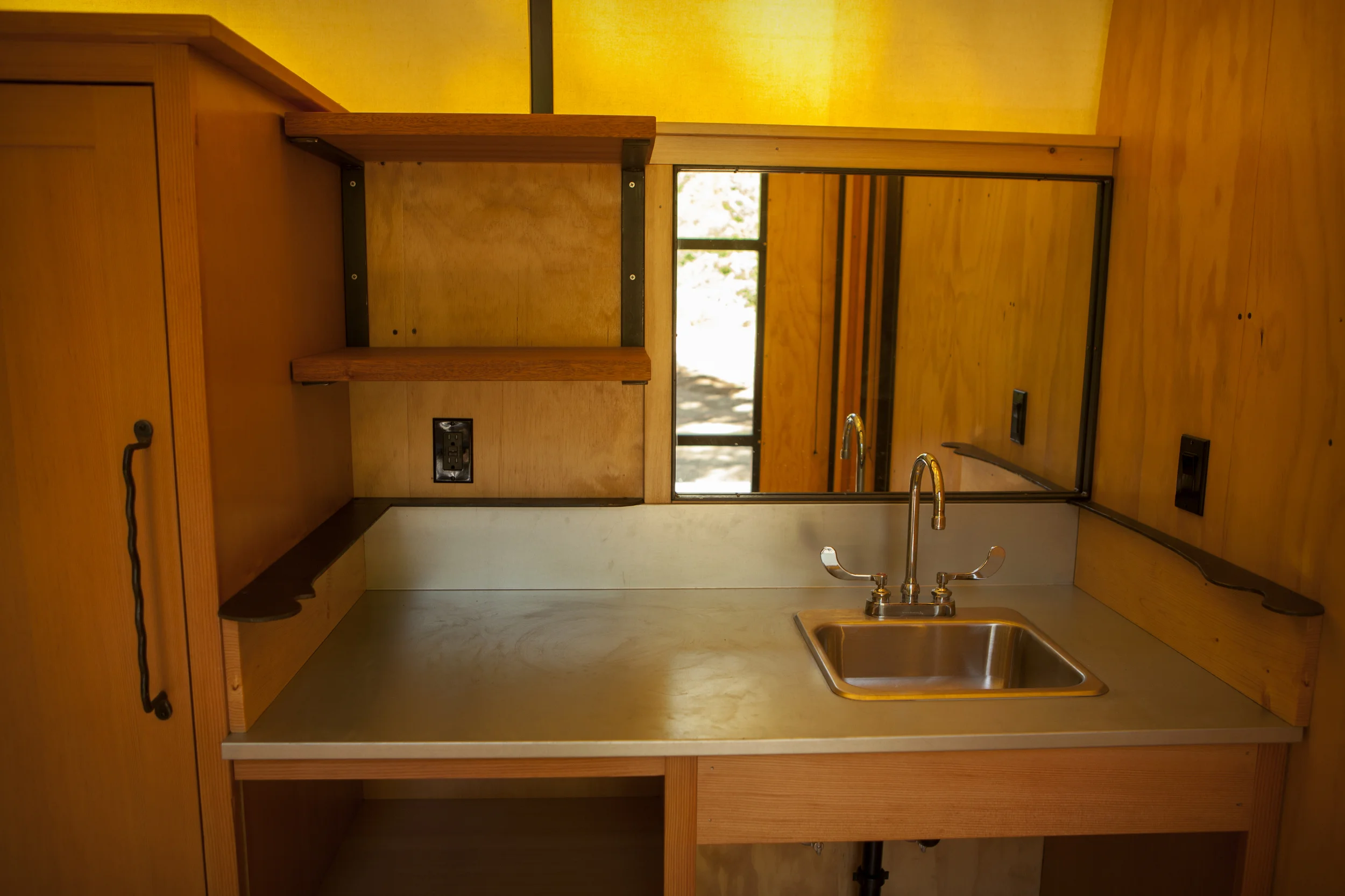 STEEL STRUCTURE WRAPPED IN CANVAS, WITH PLYWOOD FLOORS AND WALLS, GLASS FACADE, CUSTOM FABRIC CURTAINS (Designed by Jeff Shelton), DOUGLAS FIR FRAMED GLASS DOORS AND WINDOWS (by Joe Babine), GALVANIZED SHEET METAL COUNTER TOP AND STAINLESS STEEL SINK BENEATH A STEEL FRAMED MIRROR, DOUGLAS FIR CABINETRY ( by Sean Nelson) WITH CUSTOM STEEL HANDLES, MAHOGANY AND STEEL SHELVING, BLOWN GLASS FIXTURES (by Saul Alzarez), ADA ACCESSIBLE MARBLE TILED BATHROOM WITH AN ELONGATED TOILET AND ROLL IN SHOWER, WITH CUSTOM STEAL SHOWER CURTAIN ROD AND TOWEL RACKS, WELDED ATOP A TRAILER FOR EASY MOBILITY.