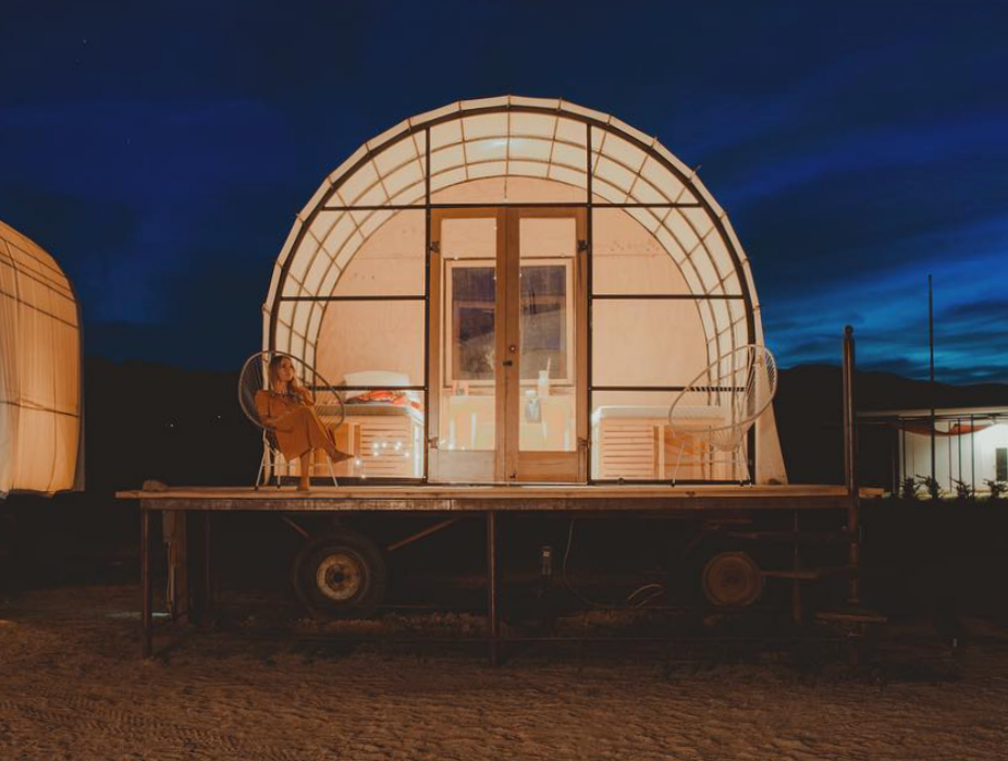STEEL STRUCTURE WRAPPED IN CANVAS, WITH PLYWOOD FLOORS AND WALLS, A GLASS FACADE, WOODEN FRAMED DOORS AND WINDOWS, WELDED ATOP A 1950'S FARM TRAILER FOR EASY MOBILITY.